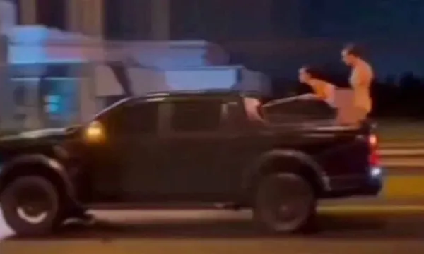 Video cho thấy một người đàn ông nước ngoài giữ eo một người phụ nữ từ phía sau trong khi cô này giữ một sợi dây buộc vào thanh chắn trên thùng xe bán tải màu đen.