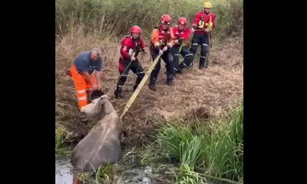 Do kích thước “khủng” của chú bò, họ phải sử dụng dây thừng chuyên dụng và một máy xúc cơ giới để nâng nó lên khỏi mặt nước. Sau gần 2 giờ đồng hồ, chú bò đã được kéo lên bờ an toàn, trong tình trạng ướt sũng nhưng không bị thương.