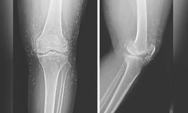 Kết quả chụp X-quang cho thấy phần bên trong xương chày dày lên và cứng lại, các khối u xương ở đầu gối, tất cả đều là các triệu chứng thường gặp của viêm xương khớp – nhưng cũng có hàng trăm sợi chỉ vàng nhỏ xíu cắm vào mô quanh đầu gối.