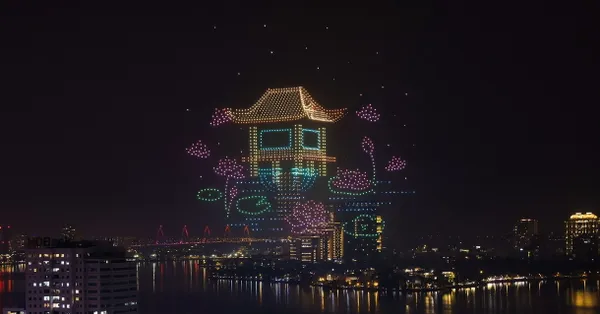 Tối 9/3, người dân Thủ đô sẽ một lần nữa được thưởng thức màn trình diễn ánh sáng với hàng trăm chiếc máy bay không người lái (drone) trên bầu trời đêm hồ Tây - Ảnh: MeKongAsian
