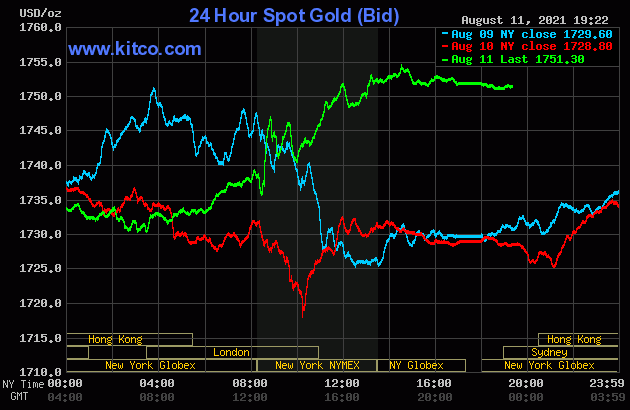 Giá vàng thế giới trên sàn Kitco giao dịch ở mức 1751.4 - 1752.4 USD/ounce. Giá vàng cao hơn khi được hỗ trợ bởi một số giao dịch mua vào. Các nhà đầu cơ giá lên kim loại quý đã ổn định thị trường vào giữa tuần, sau áp lực bán ra gần đây. Giá vàng kỳ hạn tháng 10 tăng 19,8 USD lên 1749,50 USD/ounce. Thị trường vàng có dấu hiệu ổn định trở lại sau đợt bán tháo từ cuối tuần vừa qua.