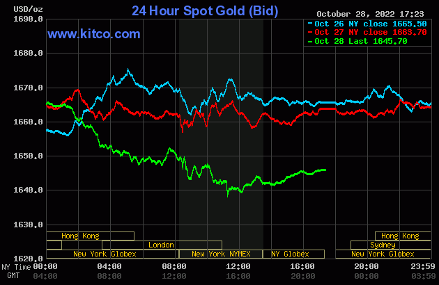 Giá vàng thế giới trên sàn Kitco khép lại phiên giao dịch cuối tuần ở mức 1645.7 - 1646.7 USD/ounce, giảm xấp xỉ 7 USD/ounce so với đầu phiên. Trong phiên, kim loại quý giao dịch trong mức 1637.7 - 1666.7 USD/ounce.