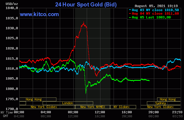 Giá vàng thế giới trên sàn Kitco giao dịch ở mức 1803.8 - 1804.8 USD/ ounce. Giá vàng trên thị trường quốc tế đang đứng giá. Đêm 5/8 (giờ Việt Nam), giá vàng thế giới giao ngay đứng quanh ngưỡng 1.811 USD/ounce. Vàng giao tháng 12 trên sàn Comex New York ở mức 1.813 USD/ounce.