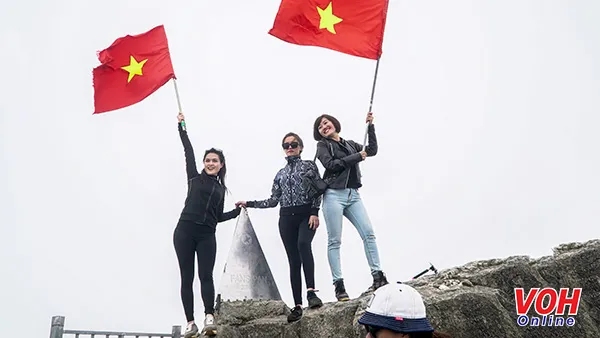 Du khách chụp hình lưu niệm tai cột mốc đỉnh Fansipan