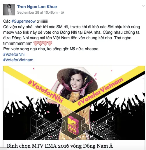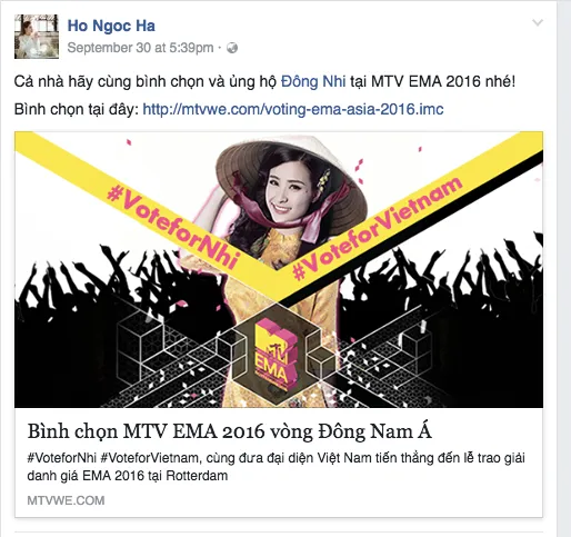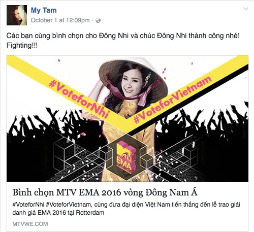 Từ khóa kèm Hashtag #VoteForNhi #VoteForVietNam #DongNhiEMA2016 do MTV Việt Nam phát động trở nên phổ biến trong các trang mạng xã hội nhằm kêu gọi bình chọn cho đại diện âm nhạc Việt Nam đầu tiên thẳng đến thảm đỏ lễ trao giải MTV EMA 2016 tại Hà Lan. Không riêng fan của Đông Nhi mà hàng loạt sao Việt cũng hết lòng ủng hộ kêu gọi fan của mình bình chọn cho đại diện Việt Nam lần này tại website của EMA 2016.