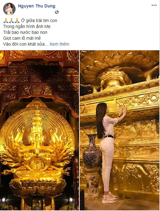 Sau một thời gian dài đóng cửa facebook, Thư Dung đã trở lại. Vừa mới đây, cô đăng lên trang cá nhân của mình một dòng trạng thái với nội dung về "Mẹ Quán Thế Âm" cùng loạt hình ảnh của mình được chụp lại trong chùa.