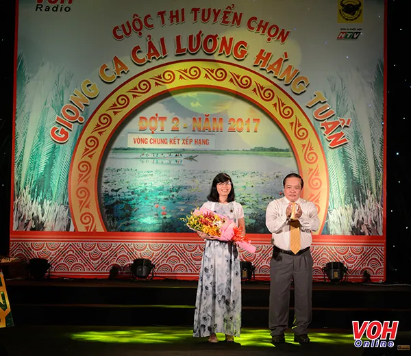 Ông Nguyễn Trọng Trí - Phó giám đốc Đài TNND TPHCM (VOH) trao hoa cho đại diện nhà tài trợ