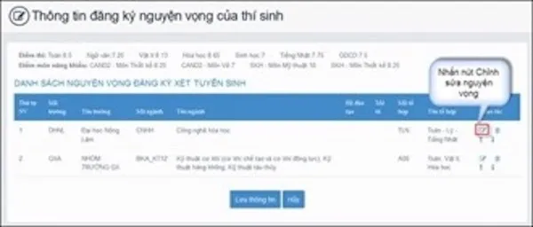 Bước 3: Chỉnh sửa nguyện vọng theo yêu cầu. Để vào màn hình sửa nguyện vọng, thí sinh nhấn nút Chỉnh sửa nguyện vọng