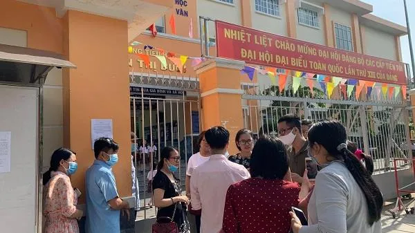 Phu huynh tập trung trước cổng trường tiểu học Trần Thị Bưởi đề xuất phản ánh về chất lượng bữa an bán trú.