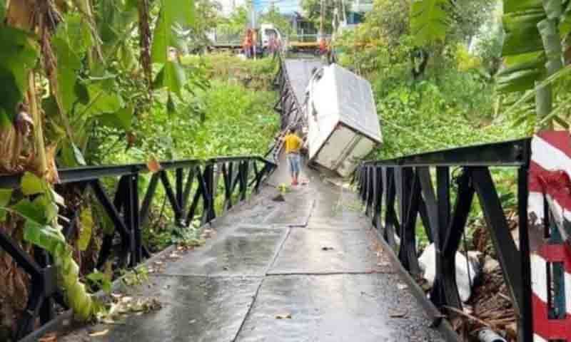 Trước đó, lúc 3h30 ngày 15/6, xe tải chở nước đá BKS 66C-140.98 có tải trọng trên 4 tấn đi qua cầu Cái Tôm Trong có tải trọng 2,5 tấn gây sập cầu.