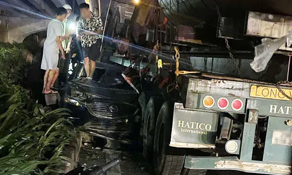 Tại hiện trường, ô tô con bị biến dạng, hư hỏng nặng, người trong xe phải thoát ra ngoài từ kính chắn gió của phương tiện. Phần đầu của xe đầu kéo cũng bị hư hỏng nặng.