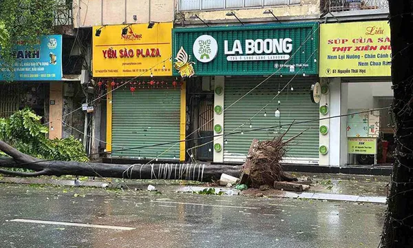 Một cây xanh bật gốc trên phố Nguyễn Thái Học quận Ba Đình.