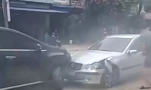 Chân phải của Hoàn đè kẹt bàn đạp ga, khiến xe tiếp tục lao về phía trước, đẩy lùi một ô tô khác mang biển số 20A-672.XX.