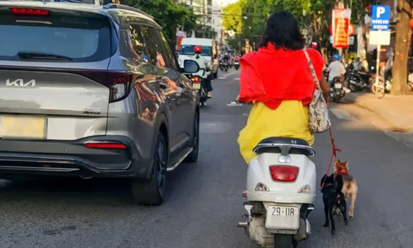 Ngày 5/4, Phòng CSGT Công an tỉnh Khánh Hòa cho biết, đơn vị đã nhận thông tin phản ánh, vào khoảng 17h ngày 25/3, trên đường Nguyễn Thị Minh Khai (TP Nha Trang) có một phụ nữ chạy xe máy mang biển số Hà Nội, không đội mũ bảo hiểm, vai dắt theo sợi dây cột 2 con chó kiểng chạy theo xe.
