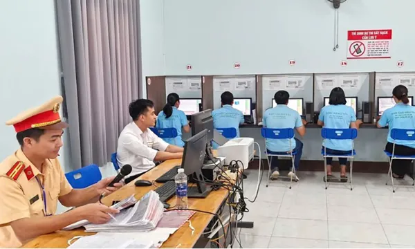 Sau phần khai mạc, các thí sinh được lực lượng CSGT hướng dẫn, quán triệt đầy đủ các quy chế, quy định, đồng thời hướng dẫn thí sinh dùng thẻ căn cước để xác thực thông tin cá nhân, danh tính học viên, tránh gian lận.
