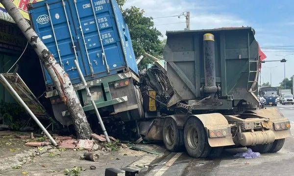 Phần đầu xe ben bị đứt lìa khỏi thùng, một thùng container rơi khỏi rơ-moóc, đè lên một ô tô con đang đậu trong cửa hàng. Ngoài ra, một cây xanh và một trụ điện ven đường cũng bị hư hỏng.