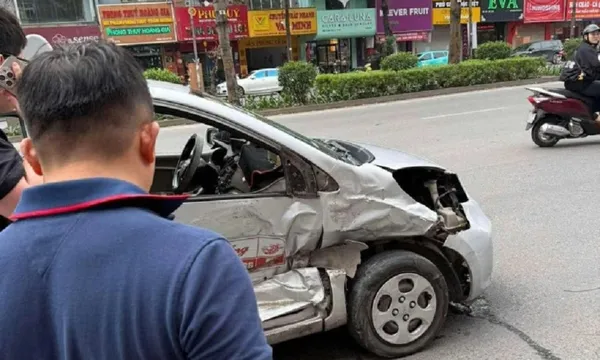 Taxi bẹp rúm phần hông sau va chạm chiều 23/2 trên phố Xã Đàn, Hà Nội - Ảnh: Xuân Hoa