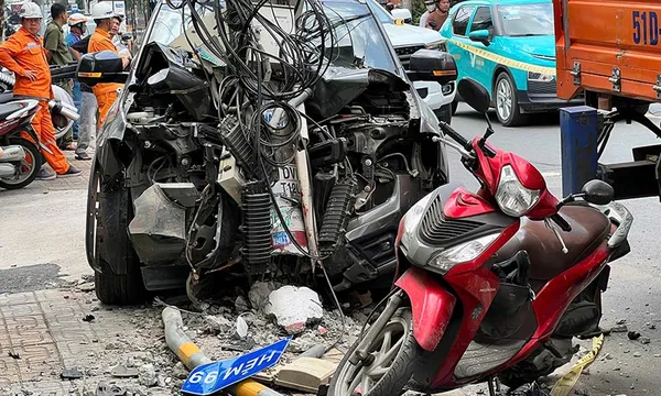 Khi đến trước số nhà 99 Đặng Văn Bi (phường Thủ Đức, TPHCM), xe bất ngờ lao qua bên phải, đâm vào cột điện. Cùng lúc, một người đàn ông từ trong cửa hàng đi ra bị xe đụng trúng.
