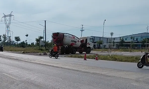 Chiếc xe bồn chở bê tông mang biển số 38H-014.xx lưu thông trên quốc lộ 8 theo hướng từ Cửa khẩu quốc tế Cầu Treo về trung tâm huyện Đức Thọ (Hà Tĩnh).