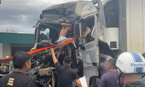Vụ tai nạn giữ 2 xe container này làm tài xế xe sau bị mắc kẹt trong cabin.