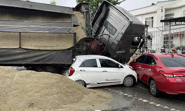 Xe đầu kéo chở cát lật nghiêng đè bẹp xe con