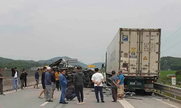 Chiếc xe tải bị hư hỏng nặng, lật nghiêng nằm chắn ngang hoàn toàn phần đường dành cho xe lưu thông theo hướng Vinh - Hà Nội khiến giao thông ách tắc kéo dài.