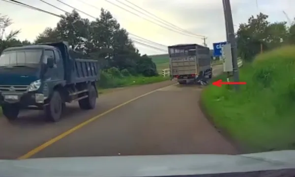 Đúng lúc này một ô tô khác đang chạy tới ở hướng ngược lại, chiếc xe tải lấn làn nảy nép vội sang phải khiến phần đuôi xe quật vào xe đạp đi cùng chiều.