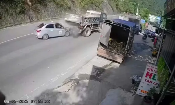 HÒA BÌNH - Chiếc xe tải bật tín hiệu báo rẽ rồi phanh lại trên đường. Đúng lúc này, xe taxi lao lên từ phía sau đâm mạnh vào đuôi xe tải khiến tài xế taxi tử vong.