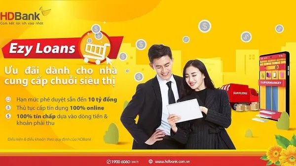 Hỗ trợ hết mình cho doanh nghiệp, chung tay đẩy lùi dịch bệnh, góp phần bình ổn giá, đảm bảo an sinh xã hội, chương trình Tín dụng 100% online - Ezy Loans của HDBank dành nhiều ưu đãi vượt trội cho các nhà cung cấp siêu thị với hạn mức tín dụng đã được phê duyệt sẵn (pre-approved) lên đến 10 tỷ đồng/nhà cung cấp. Khách hàng được sử dụng hạn mức tín dụng không cần bổ sung tài sản bảo đảm với lãi suất ưu đãi, đồng thời miễn phí chuyển khoản và các dịch vụ khác tại HDBank.