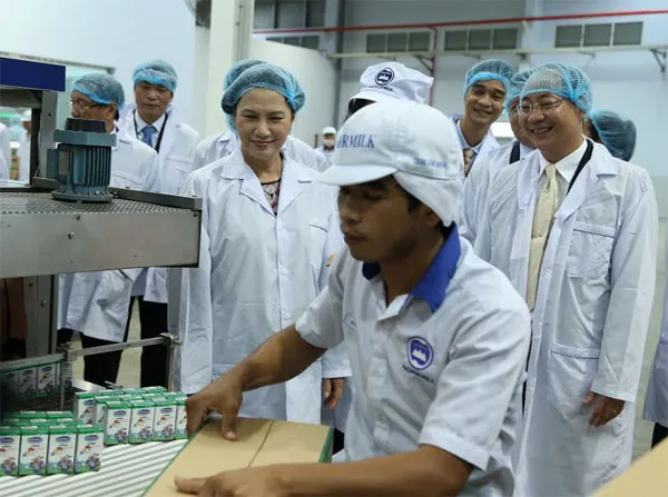 Chủ tịch Quốc hội Nguyễn Thị Kim Ngân và các đại biểu tham quan khu vực đóng gói của sản phẩm sữa nước tại Nhà máy Angkor.