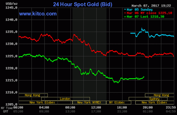Chốt phiên rạng sáng nay tại Mỹ (giờ Hà Nội), giá vàng thế giới đã xuống còn 1.216 USD/oz, mất 9 USD/oz so với chốt phiên trước đó, tương đương giảm 0,64% giá trị. Vàng giao kỳ hạn tháng 4 cũng sụt giảm với mức tương tự về mức 1.216 USD/oz.