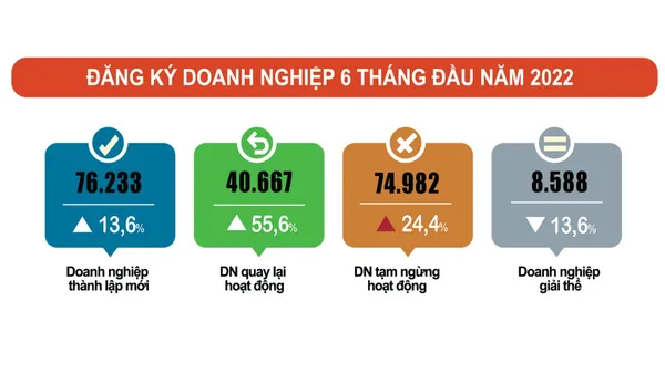 Nếu tính cả 1.847,9 ngàn tỷ đồng vốn đăng ký tăng thêm của gần 27 ngàn lượt doanh nghiệp tăng vốn, tổng số vốn đăng ký bổ sung vào nền kinh tế trong 6 tháng đầu năm 2022 là 2.730 ngàn tỷ đồng, tăng 30,3% so với cùng kỳ năm trước. Bên cạnh đó, còn có gần 40,7 ngàn doanh nghiệp quay trở lại hoạt động (tăng 55,6% so với cùng kỳ năm 2021), nâng tổng số doanh nghiệp thành lập mới và doanh nghiệp quay trở lại hoạt động trong 6 tháng đầu năm 2022 lên 116,9 ngàn doanh nghiệp, tăng 25,4% so với cùng kỳ năm trước.