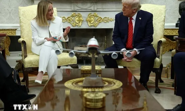Tổng thống Mỹ Donald Trump và Thủ tướng Italy Giorgia Meloni lạc quan về khả năng có thể đạt được thỏa thuận thuế quan giữa Mỹ và Liên minh châu Âu - Ảnh: REUTERS/TTXVN