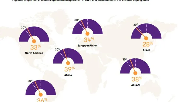 Kết quả khảo sát theo khu vực của Grant Thornton International về tỷ lệ nữ giới nắm giữ các vị trí lãnh đạo năm 2021.