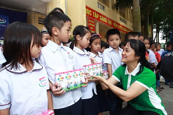 Bà Nguyễn Minh Tâm – Giám đốc Chi nhánh Vinamilk tại Hà Nội trao quà cho các em học sinh.