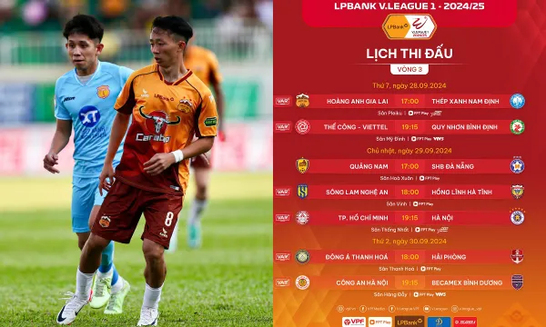 Diễn ra sớm nhất tại vòng 3 V-League 2024/25 là cuộc đối đầu được chờ đợi giữa Hoàng Anh Gia Lai (HAGL) vs Nam Định. Đội bóng phố Núi trải qua hai trận toàn thắng để chiếm ngôi đầu BXH, trong khi nhà vô địch V-League vừa tìm lại niềm vui chiến thắng sau thất bại ở ngày ra quân. Ở trận đấu diễn ra sau đó, Viettel tiếp đón Bình Định.