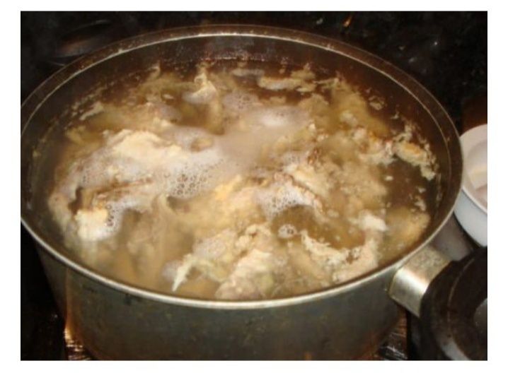 Canh chừng thịt vừa chín tới thì đổ khoảng ½ lít nước hầm xương vào chảo, đậy nắp lại và đun sôi. Khi nước trong chảo đã sôi, bạn vớt hết bọt nổi trên mặt để cho nước có được độ trong và đẹp mắt.