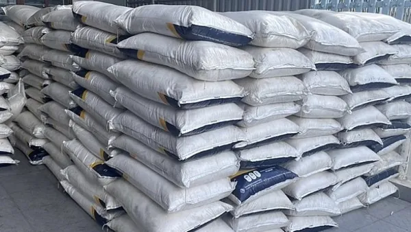 Các bao tải đường loại 50 kg/bao, bên ngoài bao bì có in chữ nước ngoài.