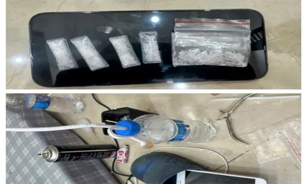 Tại hiện trường, công an thu giữ 1 bộ dụng cụ sử dụng ma túy và 1 gói nilon chứa các hạt tinh thể màu trắng nghi ma túy. Kiểm tra trên người Nguyễn Liêu Hải Đăng, lực lượng chức năng tiếp tục phát hiện 5 gói nilon chứa tinh thể tương tự.