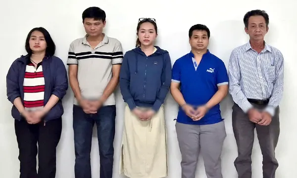 Từ trái qua: Phạm Thị Quyên, Bùi Đức Nhiên, Nguyễn Thạch Thảo Nguyên, Nguyễn Hoàng Thái Dương, Nguyễn Minh Dũng - Ảnh: Công an cung cấp