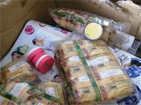 Các mặt hàng bị làm giả, gồm: bột giặt Omo, dầu gội đầu Clear, giầy thể thao Adidass và hàng ngàn gói trà giả nhãn hiệu “Trà Ngọc Trang nhãn hiệu chim én”.