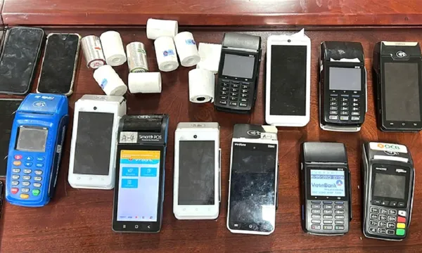 Tang vật thu giữ từ hai đối tượng này bao gồm 14 máy POS, 15 thẻ thanh toán ngân hàng và 186 hóa đơn.
