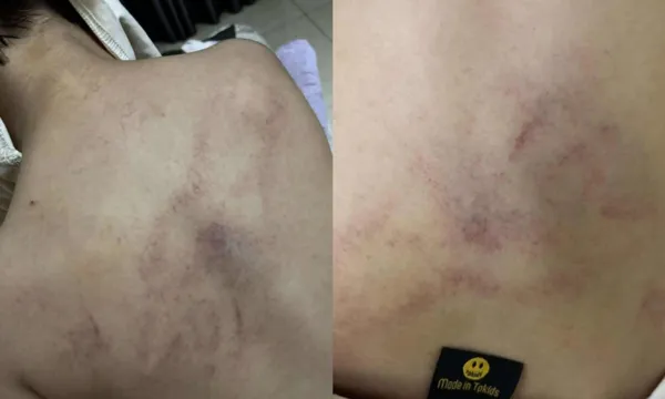 Theo anh T., chiều 5/7, khi tắm cho con gia đình phát hiện nhiều vết bầm tím lớn trên lưng bé, dấu hiệu tổn thương rõ ràng.