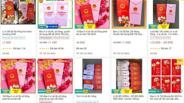 Trên mạng xã hội, các sàn thương mại điện tử và tại các chợ hiện đang bán rất nhiều bao lì xì loại in hình sổ đỏ, sổ hồng. Nhiều người cho rằng loại bao lì xì này sẽ là lời chúc năm mới nhiều tiền tài, thêm tiền, thêm đất – nên mua khá nhiều để lì xì người thân, bạn bè.