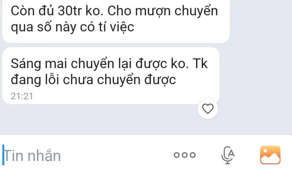 Sau khi hack tài khoản, kẻ xấu gửi tin nhắn với nội dung: "Còn đủ 30 triệu không. Cho mượn chuyển qua số này có việc. Sáng mai chuyển lại được không, tài khoản đang lỗi chưa chuyển được".