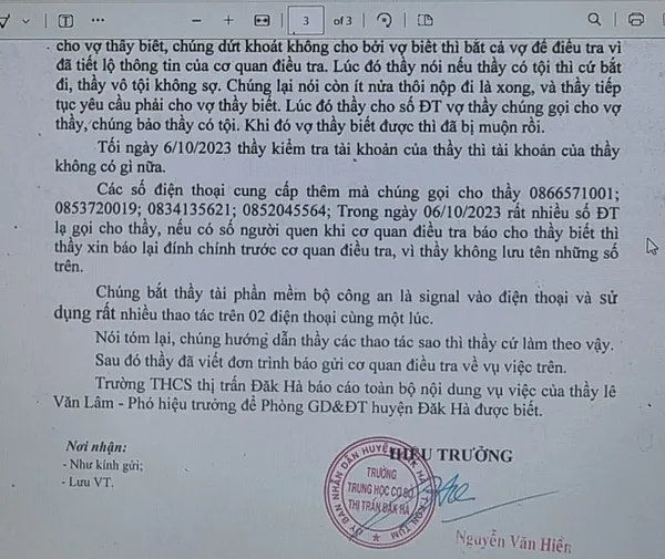 Theo báo cáo từ Trường THCS thị trấn Đăk Hà, huyện Đăk Hà, tỉnh Kontum, có trường hợp giáo viên của trường bị lừa qua điện thoại với số tiền 1,1 tỷ đồng. Đó là thầy giáo Lê Văn Lâm đã bị người lạ giả danh công an lừa, chiếm đoạt 1,1 tỷ đồng.