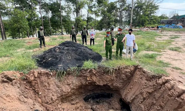 Tiến hành khám nghiệm hiện trường, công an xác định các đối tượng đã chôn lấp 1.623 tấn xỉ chì thải ra môi trường.