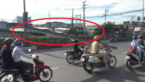 Bước đầu lực lượng chức năng đo thanh sắt có chiều dài 6,8m. Thanh niên này tên V.T.H. (25 tuổi, quê Đồng Nai), bị CSGT lập biên bản xử phạt 500.000 đồng lỗi chở hàng cồng kềnh, vượt quá giới hạn quy định.