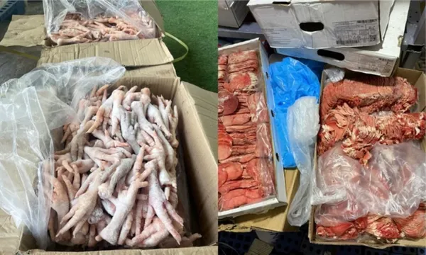 Khi kiểm tra phát hiện tại hai kho lạnh của công ty chứa các loại thực phẩm đông lạnh gồm chân gà, cơm lam, bò viên, cá trứng, ốc nhồi thịt, vây cá hồi, lưỡi trâu, chả ram tôm đất… với tổng khối lượng khoảng 2.592kg.