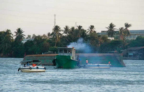 Chiếc sà lan tông sập cầu Ghềnh đang được kéo ra khỏi khu vực cầu - Ảnh: Xuân An/ TTO.